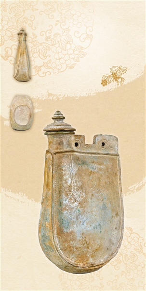 绿釉划花扁身双孔鸡冠壶腹部刻有葡萄纹,这个借鉴中原瓷器的纹饰既为器物增添雅致,又有福寿延绵的吉祥寓意。
