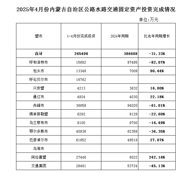 2025年1-4月份全区公路水路交通固定资产投资完成情况