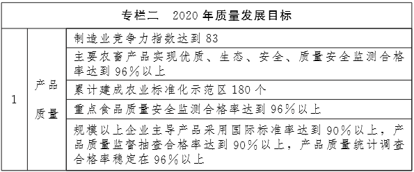 到2020年底,质量发展取得明显成效,质量发展机制更加完善,质量基础达到较高水平,技术创新能力和品牌竞争能力显著增强,质量总体水平达到国家中等以上水平,质量发展成果惠及民众。