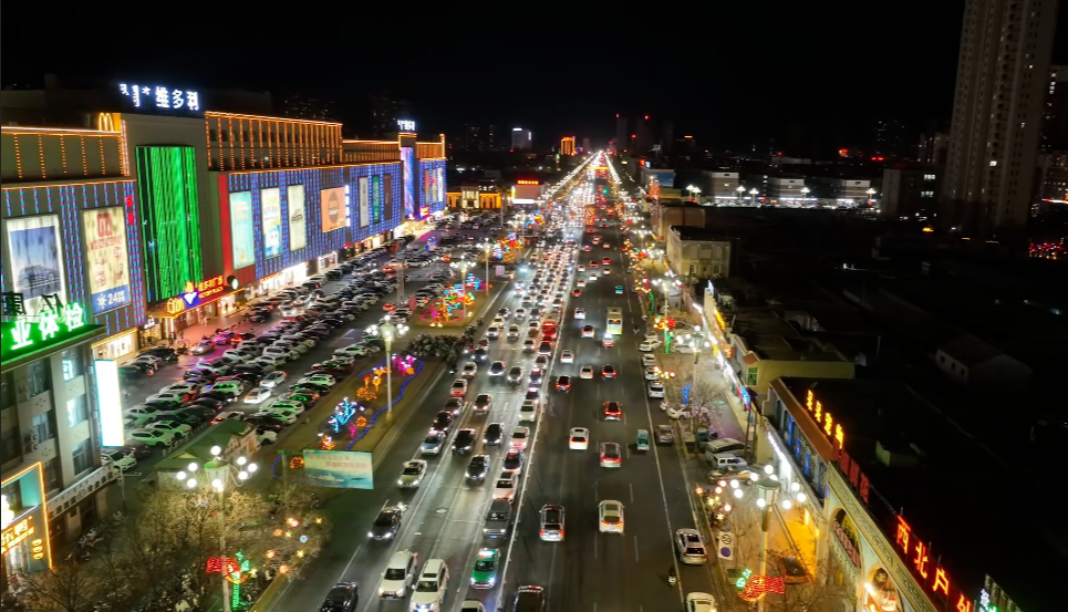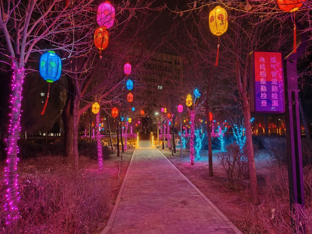 本次亮化围绕“福满临河·灯映新春”主题,重点打造7条主干道部分路段、4大城区出口、5处道路节点及12座公园广场。夜幕降临,金川大道两侧悬挂的“福韵灯笼”串联起一条绵延的“福运长廊”,寓意“福到万家、万象更新”;新华街分段呈现不同风格,维多利段七彩幻彩灯则勾勒出一条梦幻的“科幻走廊”,九完小段的炫酷圆球灯现代灵动,百货大楼段的国韵灯笼典雅庄重;胜利路点缀着暖色的藤球灯,如星光般柔和垂落,为街道增添温馨雅致的氛围;公园北街则以红色绒布灯笼与石榴灯妆点,搭配灯笼天幕。