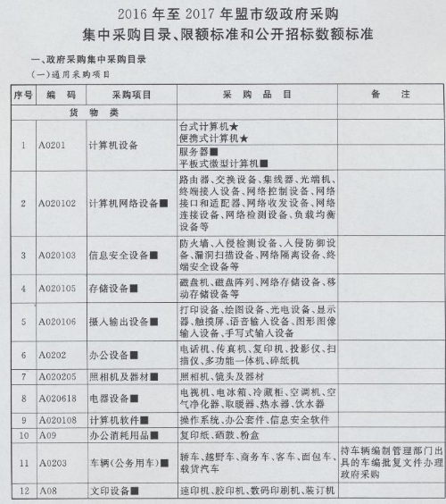 根据《中华人民共和国政府采购法》、《中华人民共和国政府采购法实施条例》和财政部《政府采购品目分类表》、《ld体育中国官方网站关于深入贯彻落实〈中华人民共和国政府采购法实施条例〉的意见》(内政发〔2015〕113号)的有关规定和要求,经自治区人民政府同意,现将《2016年至2017年盟市级政府采购集中采购目录、限额标准和公开招标数额标准》予以公布,并提出以下要求,请认真贯彻执行。