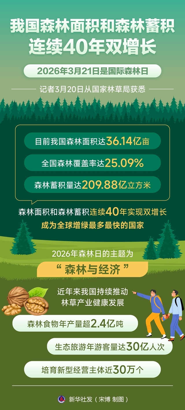 3月21日是国际森林日。记者3月20日从国家林草局获悉,目前我国森林面积达36.14亿亩,全国森林覆盖率达25.09%,森林蓄积量达209.88亿立方米,森林面积和森林蓄积连续40年实现双增长,成为全球增绿最多最快的国家。